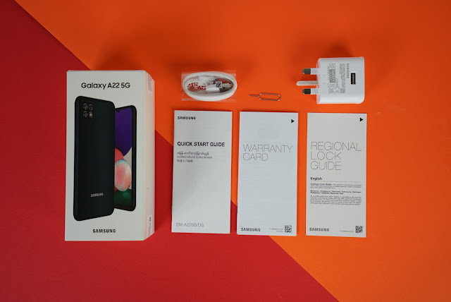 The Galaxy A22 is equipped with a Quick Start Guide, Warranty Card, Regional Lock Guide, an Ejection Pin, a Charging Cable, and a 15W Super Fast Charging Adapter too!